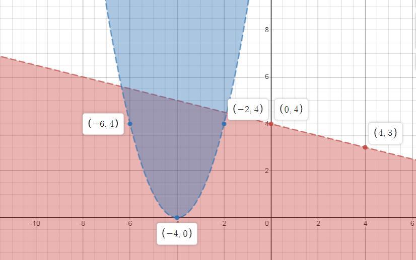 Dotted linear inequality shaded below passes through (0, 4) & (4,3). Dotted parabolic inequality shaded above passes through points (negative 6,4), (negative 4, 0) & (negative 2, 4).