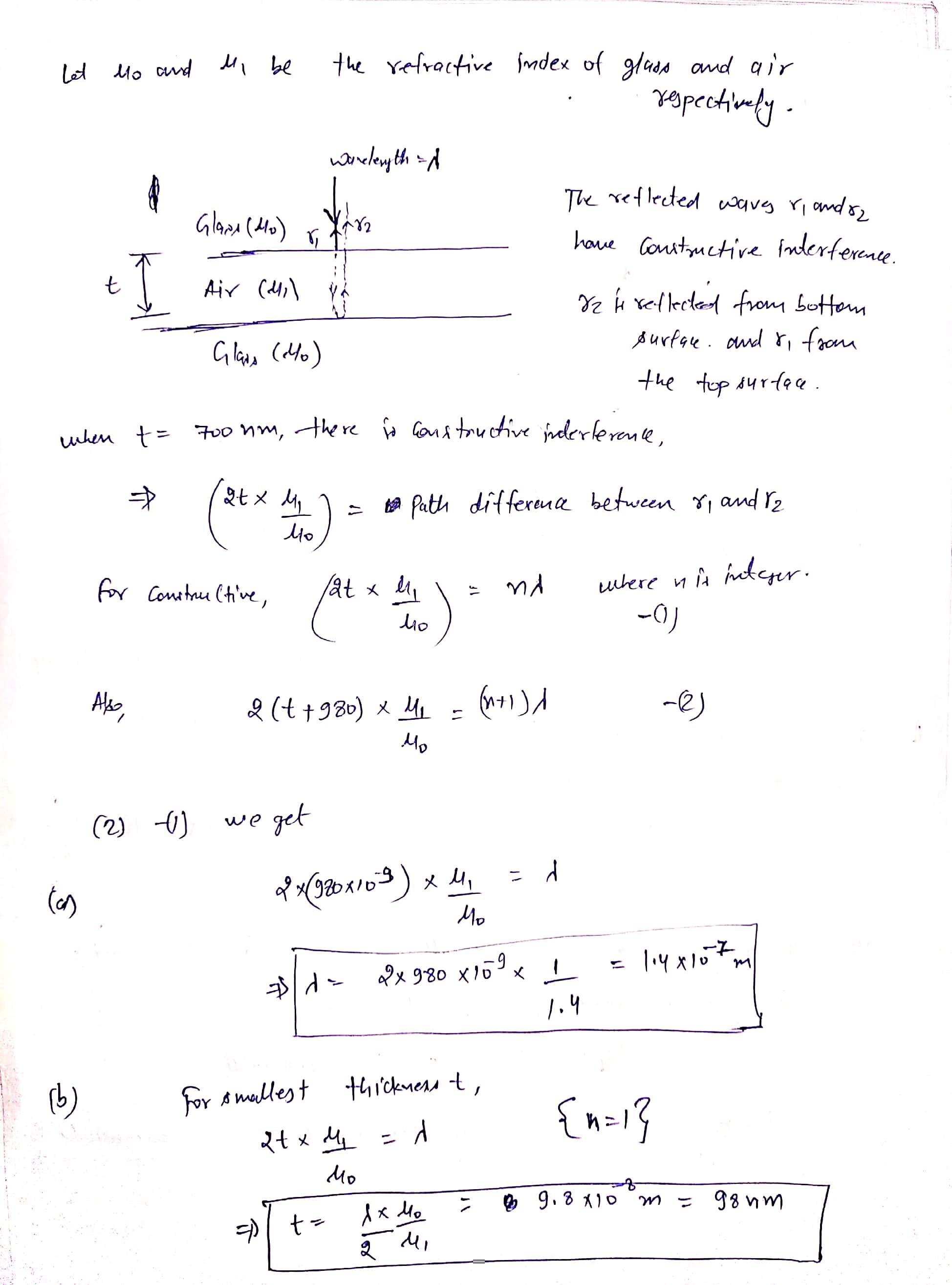 Thus, the smallest thickness t of the air film = 140 nm