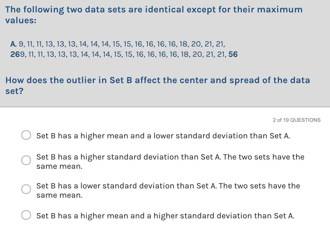 Answer: D. Set B has a higher mean and a Higher standard deviation than Set A