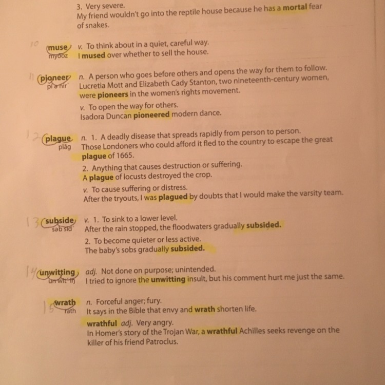 11. A long time ago, Pioneers made up the American society. 12. Without antibiotics, we wouldn't be able to stop a plague. 13. lol my grades were subsiding. 14. I unwitting broke my mom's vase 15. I unleashed my wrath against another opponent to win the game.