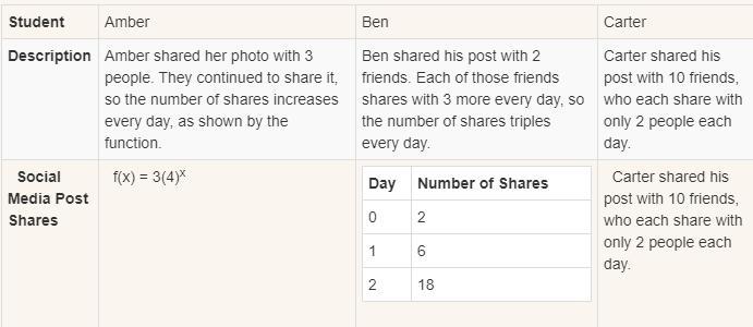 Amber's post travels the fastest because by day 10, she has more than 25 times the shares of her closest competitor. Additionally, her growth factor is 4, while Bens is 3 and Carter is 2.