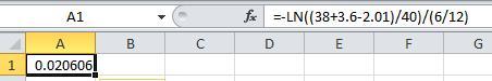 = -ln((38 + 3.60 - 2.01) ÷ 40) ÷ (6 ÷ 12)