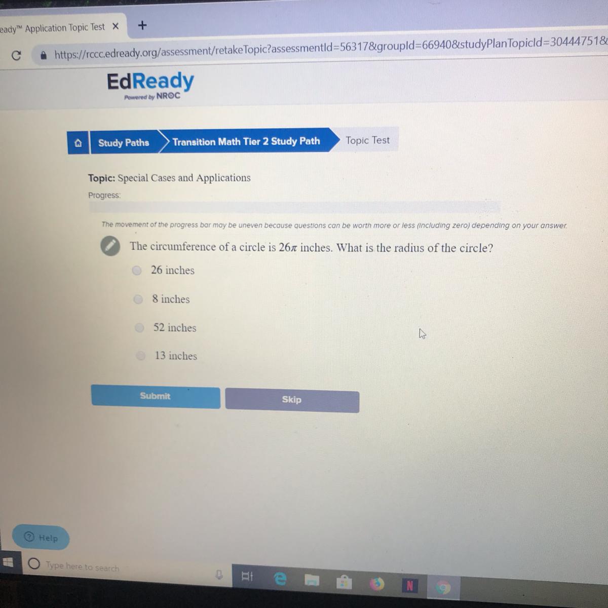radius = circumference /(2×pi) =26×pi / (2×pi) = 13
