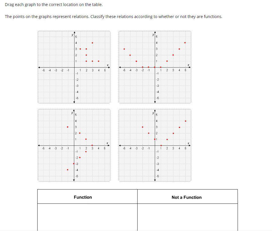 The relations of the two graphs on the left are not functions; the relations of the two graphs of the right are functions.