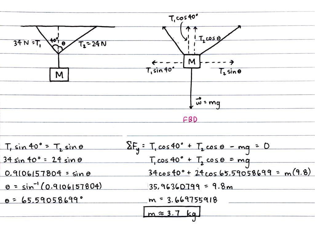 This means that T₁ sin(40) is equal to T₂ sin(Θ). Set them equal to each other in an equation and solve for the angle Θ. We are given the tension forces: T₁ = 34 N and T₂ = 24 N.