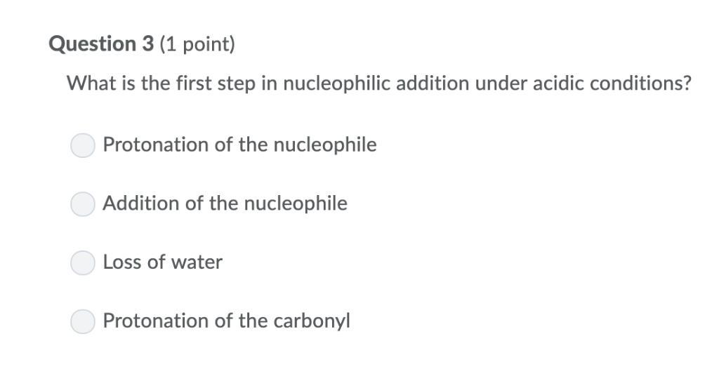 A nucleophile view the full answer Question 3 (1 point) What is the first step in nucleophilic addition under acidic conditions? Protonation of the nucleophile Addition of the nucleophile Loss of water Protonation of the carbonyl