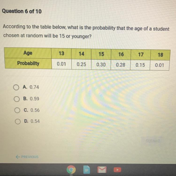 In general terms, the probability of two or more events can be calculated by adding the probability of each event. This rule applies when an event is considered as mutually exclusive. Age is considered as a mutually exclusive event because if a random individual is selected he/she will be only one age. In this context, if you need to know the probability that a student is 15 or younger it is necessary to add the probability that a student is 15, the probability that the student is 14, and the probability that the student is 13. The process is shown below: