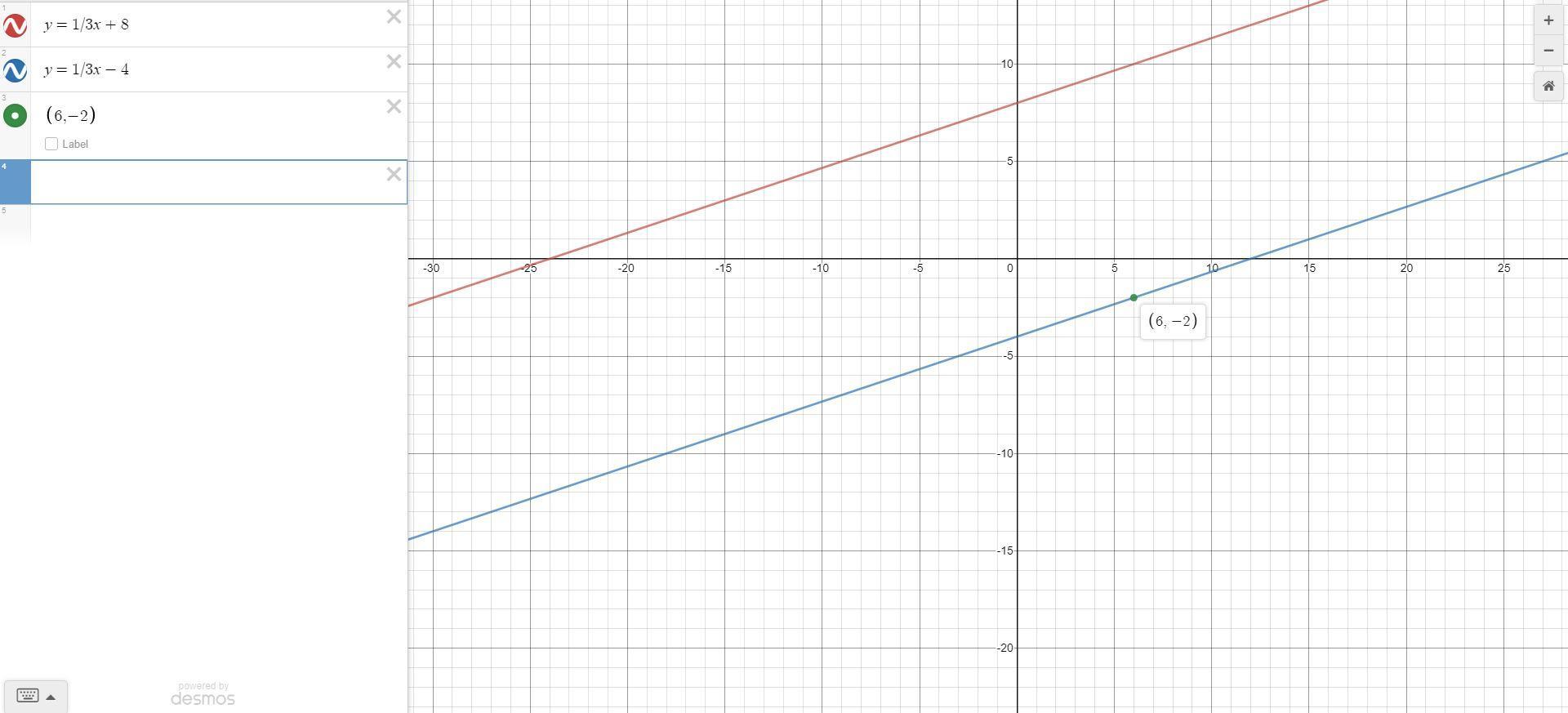 The equation parallel to y=1/3x + 8 and passes through point (6, -2) is y = 1/3x - 4