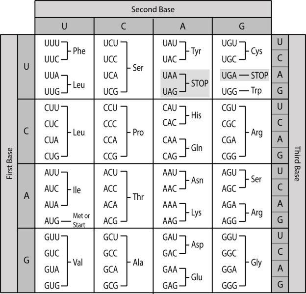 There are 22 amino acids used to make proteins, but 64 possible codons, so some amino acids correspond to more than one codon. All proteins start with methionine (Met) and there are also codons that mark the end of a protein.