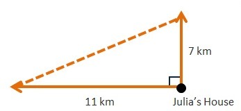 Samantha and Mia each left Julia’s house at the same time. Mia walked north at 7 kilometers per hour. Samantha ran west at 11 ki
