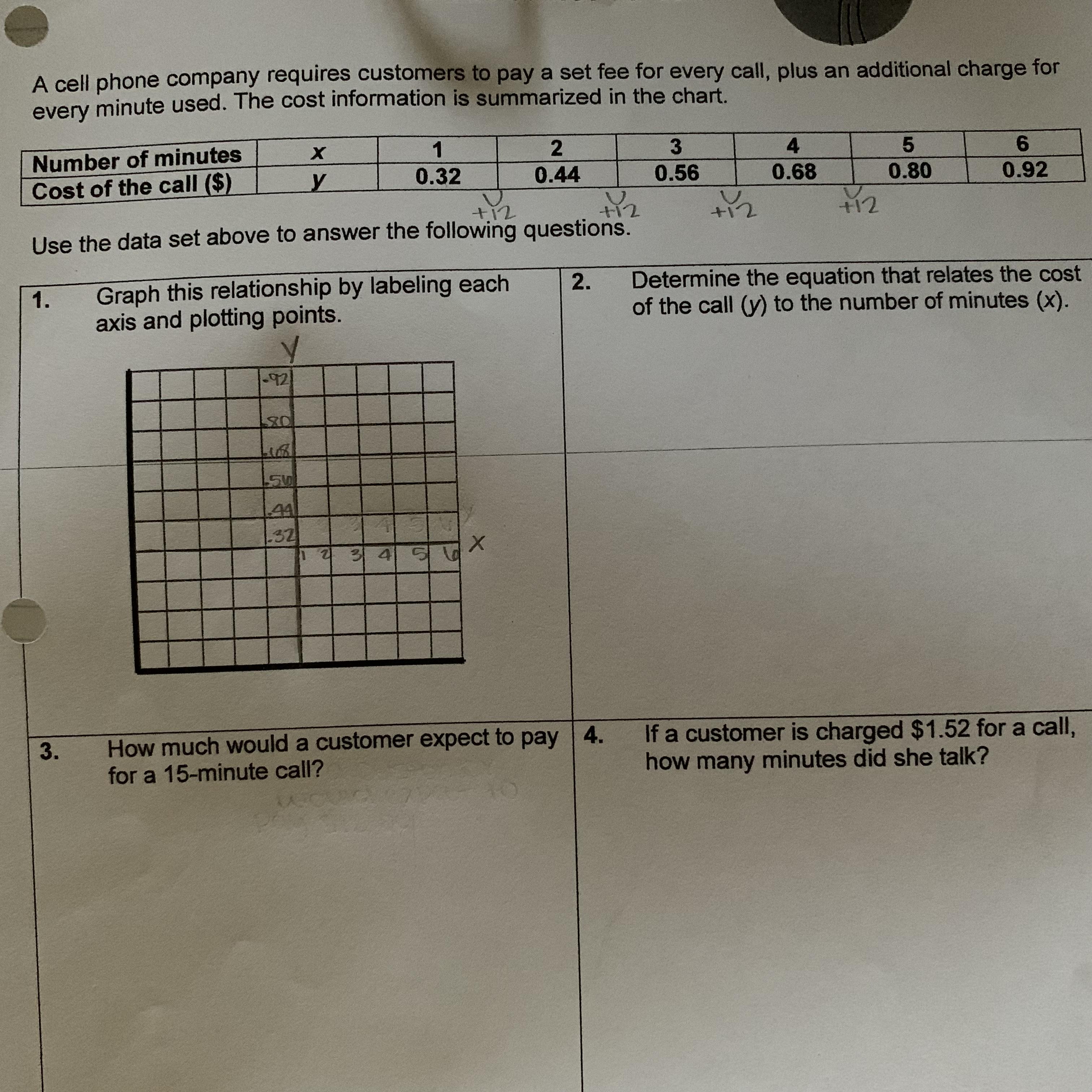 Equation gotten in the previous part of the exercise relate y (cost of the call) with x (number of minutes). So, if you replace x = 15 minutes, then you will get call cost in $.