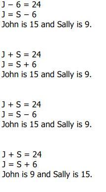 J+S=24 and J=S+6 represents the relationship between ages.