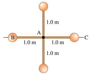 In the attached picture, neglecting the masses of the rods joining the masses, and taking into account that all masses are equal each other, being  equal to m kg, we can write the following equation:
