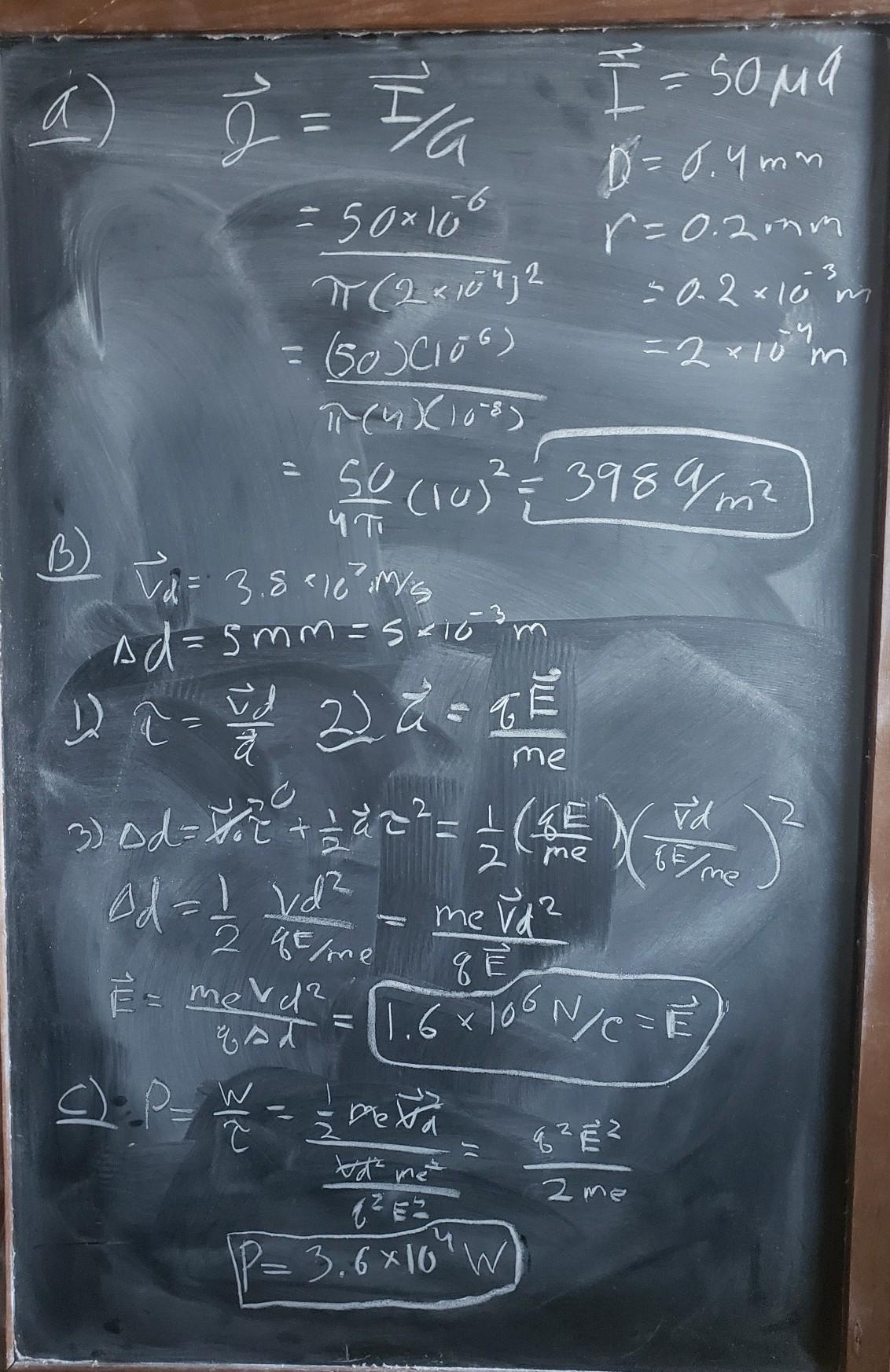 This one took the most work for me. I used a kinematic equation (yes they apply to electrons) to find the electric field (E). I used a modified form of the familiar: ∆d=V₀τ+aτ²/2