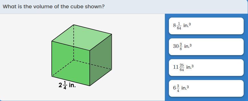 2.25 is 2 1/4 in decimal form. Since all sides of the cube are the same, 2.25^3 is 11.39063, estimated 11.39.