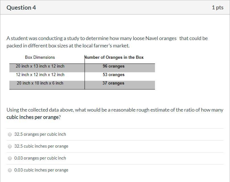 The question asks for "cubic inches per orange." Only two answer choices have those units. One of them is 32.5; the other is 0.03.