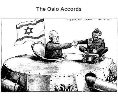 Obviously it were the Israelis. Although Oslo agreement meant the mutual recognition as it can be seen in cartoon, Arafat is driving a small vehicle around the strong Israeli submarine, that is presented as the strongest element. The agreement was achieved, but Israel still has the main role.