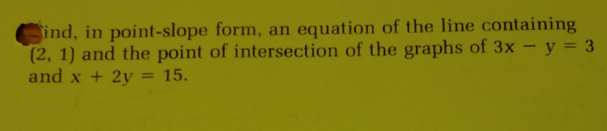 As stated in the question, one of the coordinate points in which the equation passes through is the intersection of the lines 3x-y=3 and x+2y=15. **note: the reason you must find the intersection of the two points is because you need two sets of coordinate points in order to calculate the slope of the line that passes through the points.