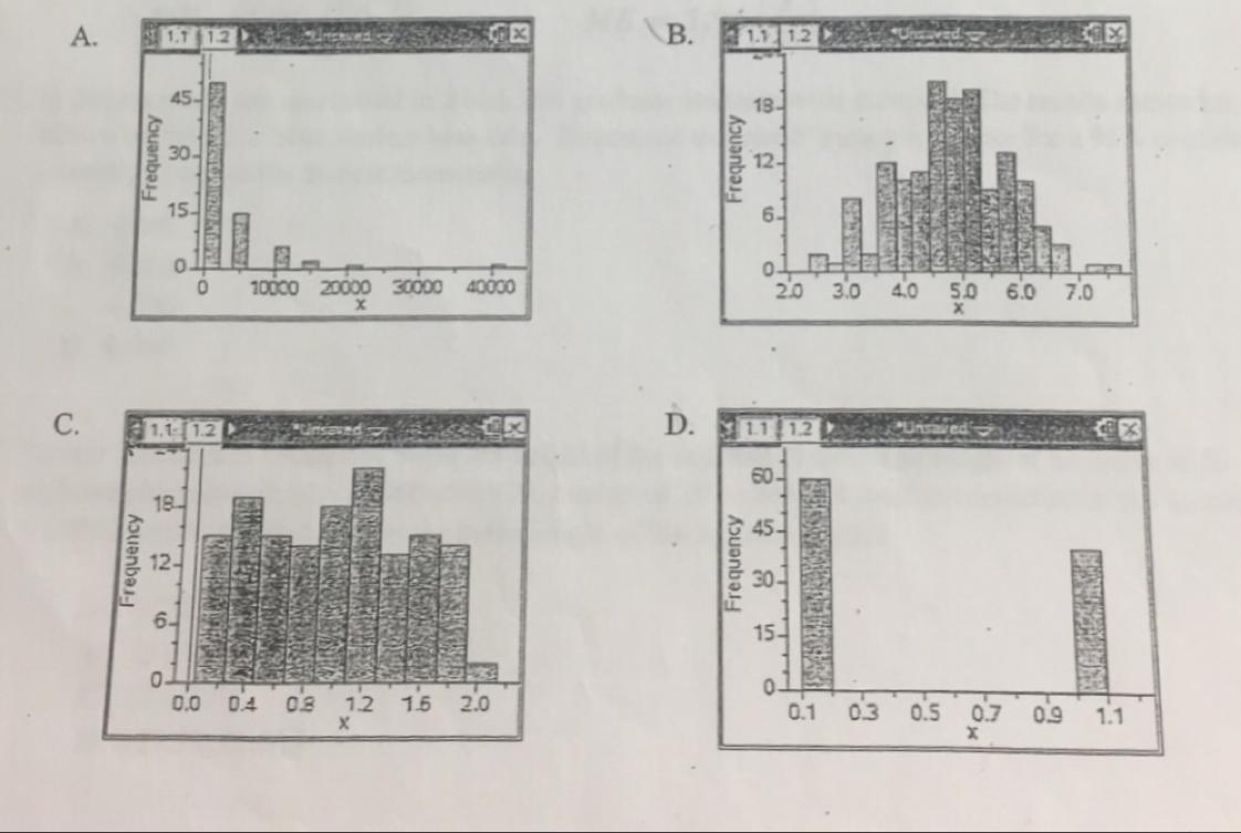 The histogram in choice C is approximately uniformly distributed since most of the observed values have an approximately equal frequency. Each of the values is approximately equally likely. The uniform distribution is not symmetric.