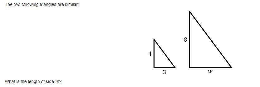 We can apply this to <em>w</em>. Look at the left triangle on the bottom and see how there is a 3. Well, we've already noticed how the triangle on the left just needs to be multiplied by 2 in order to get to the one on the right, so that's what we should do! When you multiply 3 by 2, you get 6 which is <em>w</em>.