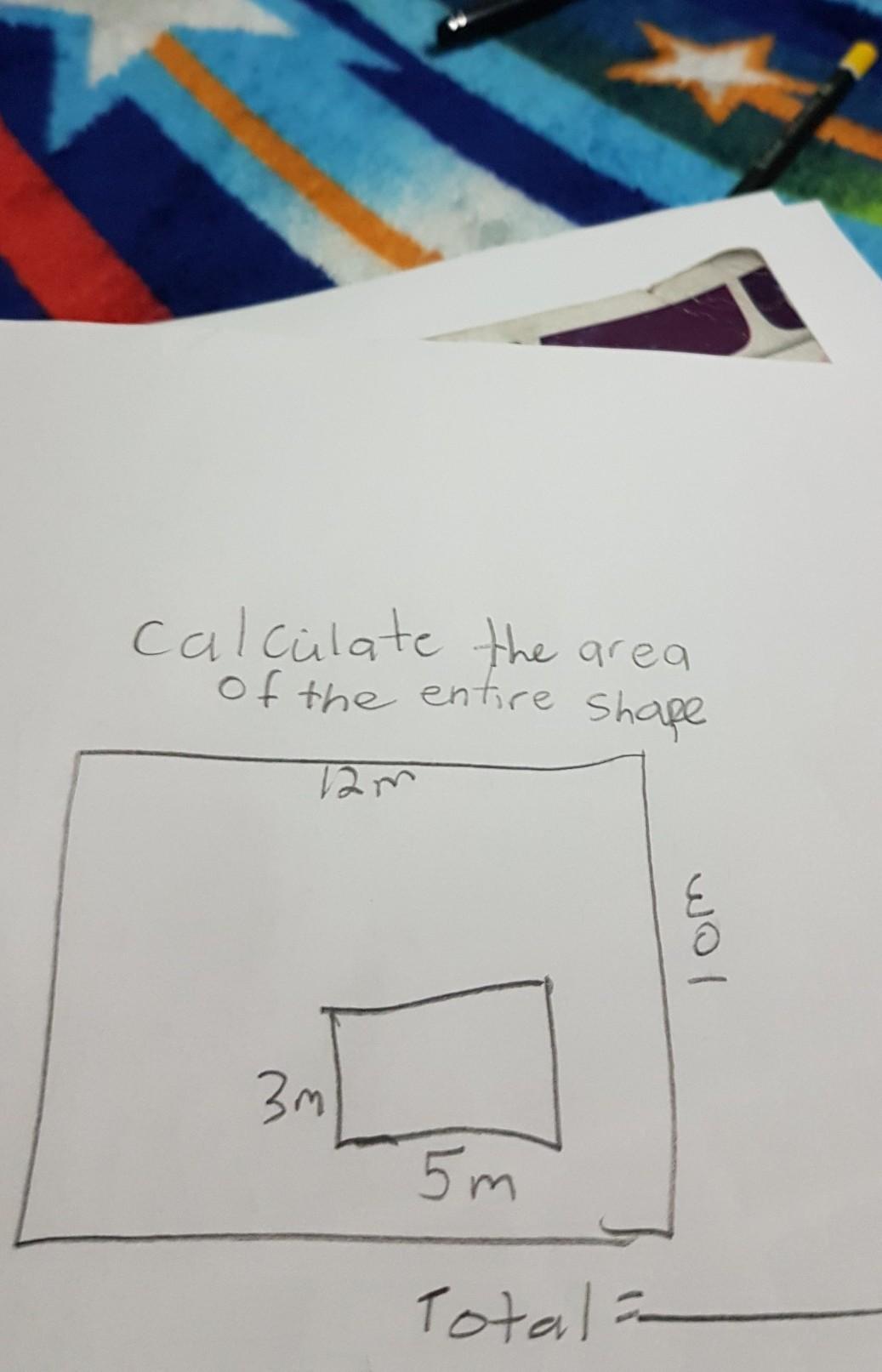 Hey! So I'm assuming that little rectangle inside the section not part of the larger rectangle. The area of bigger rectangle without the smaller rectangle is 12 * 10 - 3 * 5 = 105 square meters.