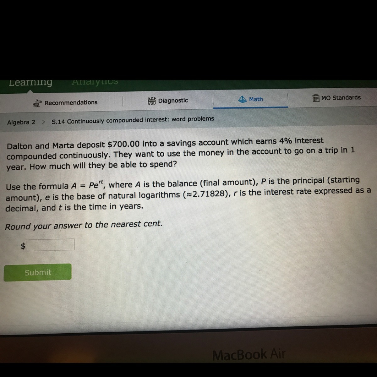 700×e^(0.04×1) ≈ 728.56754 ≈ 728.57 (rounded)