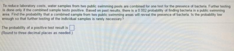 Generally the the probability that a combined sample from public swimming areas will reveal the presence of bacteria is equivalent to the probability that at least one of the sample will reveal the presence of bacteria and this is mathematically represented as