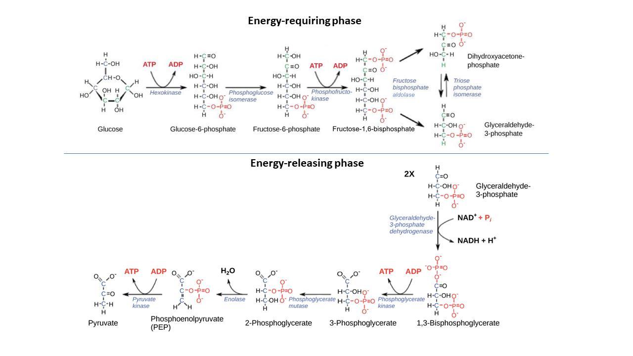The glycolysis is the first step in glucose degradation that generated energy for the cellular metabolism. The glycolysis has two phases: one that requires energy and other that releases energy. These phases are described in the attached image.