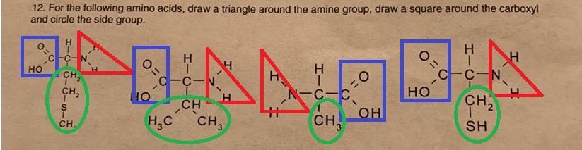 For the following amino acids, draw a triangle around the amine group, draw a square around the carboxyl and circle the side gro