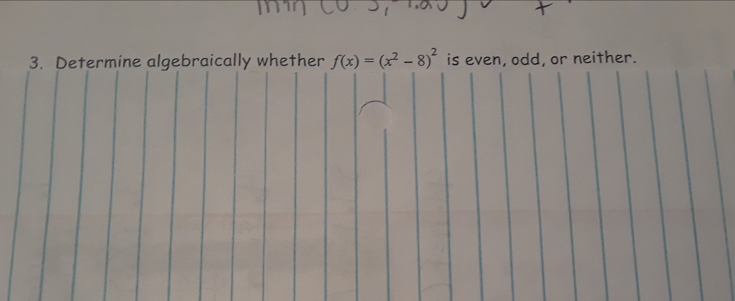 ![\bf f(x)=(x^2-8)^2\implies f(x)=(x^2-8)(x^2-8)\implies f(x)=\stackrel{FOIL}{x^4-16x^2+64}\\\\[-0.35em]~\dotfill\\\\f(-x)=(-x)^4-16(-x)^2+64\qquad \begin{cases}(-x)(-x)(-x)(-x)=x^4\\(-x)(-x)=x^2\end{cases}\\\\\\f(-x)=x^4-16x^2+64\impliedby \stackrel{\textit{same as the original}}{Even}](https://tex.z-dn.net/?f=%20%5Cbf%20f%28x%29%3D%28x%5E2-8%29%5E2%5Cimplies%20f%28x%29%3D%28x%5E2-8%29%28x%5E2-8%29%5Cimplies%20f%28x%29%3D%5Cstackrel%7BFOIL%7D%7Bx%5E4-16x%5E2%2B64%7D%5C%5C%5C%5C%5B-0.35em%5D~%5Cdotfill%5C%5C%5C%5Cf%28-x%29%3D%28-x%29%5E4-16%28-x%29%5E2%2B64%5Cqquad%20%5Cbegin%7Bcases%7D%28-x%29%28-x%29%28-x%29%28-x%29%3Dx%5E4%5C%5C%28-x%29%28-x%29%3Dx%5E2%5Cend%7Bcases%7D%5C%5C%5C%5C%5C%5Cf%28-x%29%3Dx%5E4-16x%5E2%2B64%5Cimpliedby%20%5Cstackrel%7B%5Ctextit%7Bsame%20as%20the%20original%7D%7D%7BEven%7D%20)