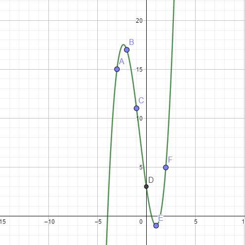 The function represented by the set of points: {(-3,15)(-2,17), (-1,11), (0,3),(1,-1), (2,5),(3,27)} has 2 turning points when plotted on a graph.