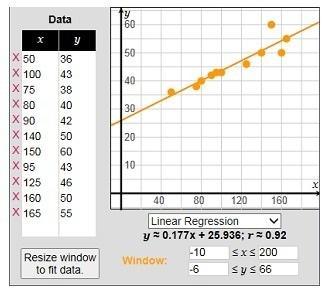 total daily wages. The table shows her data for 2 weeks. A 2-column table with 11 rows. The first column is labeled x with entries 50, 100, 75, 80, 90, 140, 150, 95, 125, 160, 165. The second column is labeled y with entries 36, 43, 38, 40, 42, 50, 60, 43, 46, 50, 55. A graph shows the horizontal axis numbered 40 to 160 and the vertical axis numbered 10 to 60. A line increases from 0 to 160. According to the line of best fit, what is the minimum amount, to the nearest dollar, Melinda will earn for each day of work, even if she serves no customers? $18 $26 $36 $40