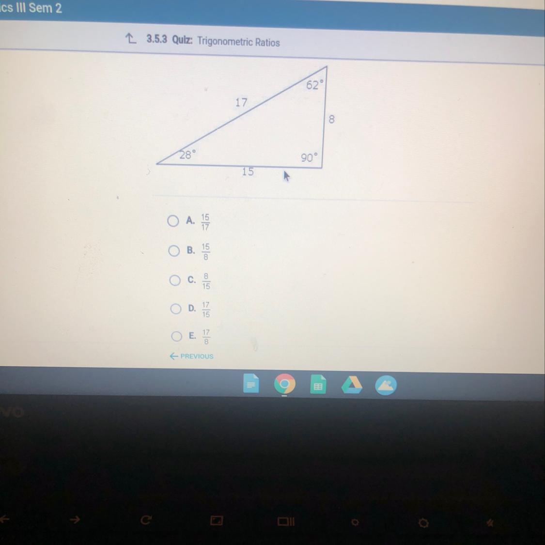 We want to find the cos(28°), then we can use the second relation, where the adjacent cathetus is 15 units long, and the hypotenuse is 17 units.