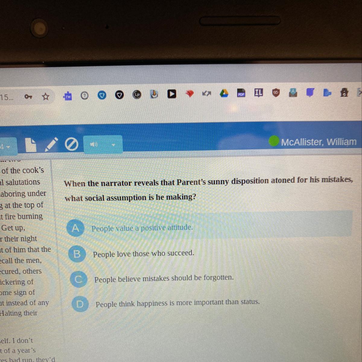 When the narrator reveals that parents sunny disposition atoned for his mistakes, People value a positive attitude.