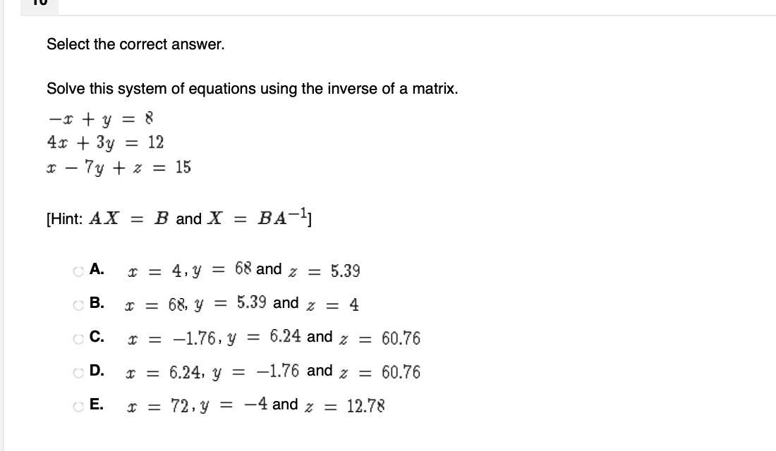 ![AX=B\\\\\left[\begin{array}{ccc}-1&1&0\\4&3&0\\1&-7&1\end{array}\right]\left[\begin{array}{c}x&y&z\end{array}\right]=\left[\begin{array}{c}8&12&15\end{array}\right]](https://tex.z-dn.net/?f=AX%3DB%5C%5C%5C%5C%5Cleft%5B%5Cbegin%7Barray%7D%7Bccc%7D-1%261%260%5C%5C4%263%260%5C%5C1%26-7%261%5Cend%7Barray%7D%5Cright%5D%5Cleft%5B%5Cbegin%7Barray%7D%7Bc%7Dx%26y%26z%5Cend%7Barray%7D%5Cright%5D%3D%5Cleft%5B%5Cbegin%7Barray%7D%7Bc%7D8%2612%2615%5Cend%7Barray%7D%5Cright%5D)