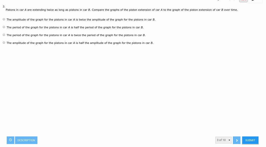 ph of the piston extension of car B over time. A) The amplitude of the graph for the pistons in car A is twice the amplitude of the graph for the pistons in car B.