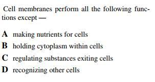 # Cell membranes perform all the following functiones except making nutrients for cells (A)