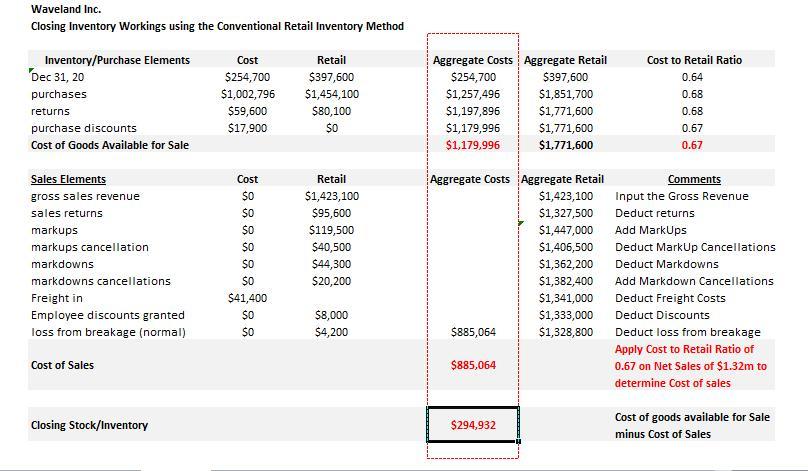 Instructions. Assuming that Waveland Inc. uses the conventional retail inventory method, compute the cost of its ending inventory at December 31, 2020.