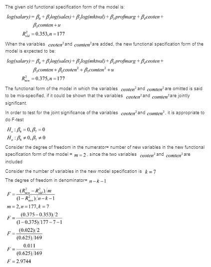 rg+ β4ceoten + β5comten + u, using the data in CEOSAL2.CSV, was R2 = .353 (n = 177). When ceoten2 and comten2 are added, R2 = .375. Is there evidence of functional form misspecification in this model?