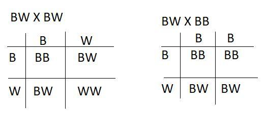 , 1/4 WW (white) chickens and 1/2 BW (blue) chickens. Crossing a black and a blue: 1/2 BW (blue) chickens and 1/2 BB (black) chickens