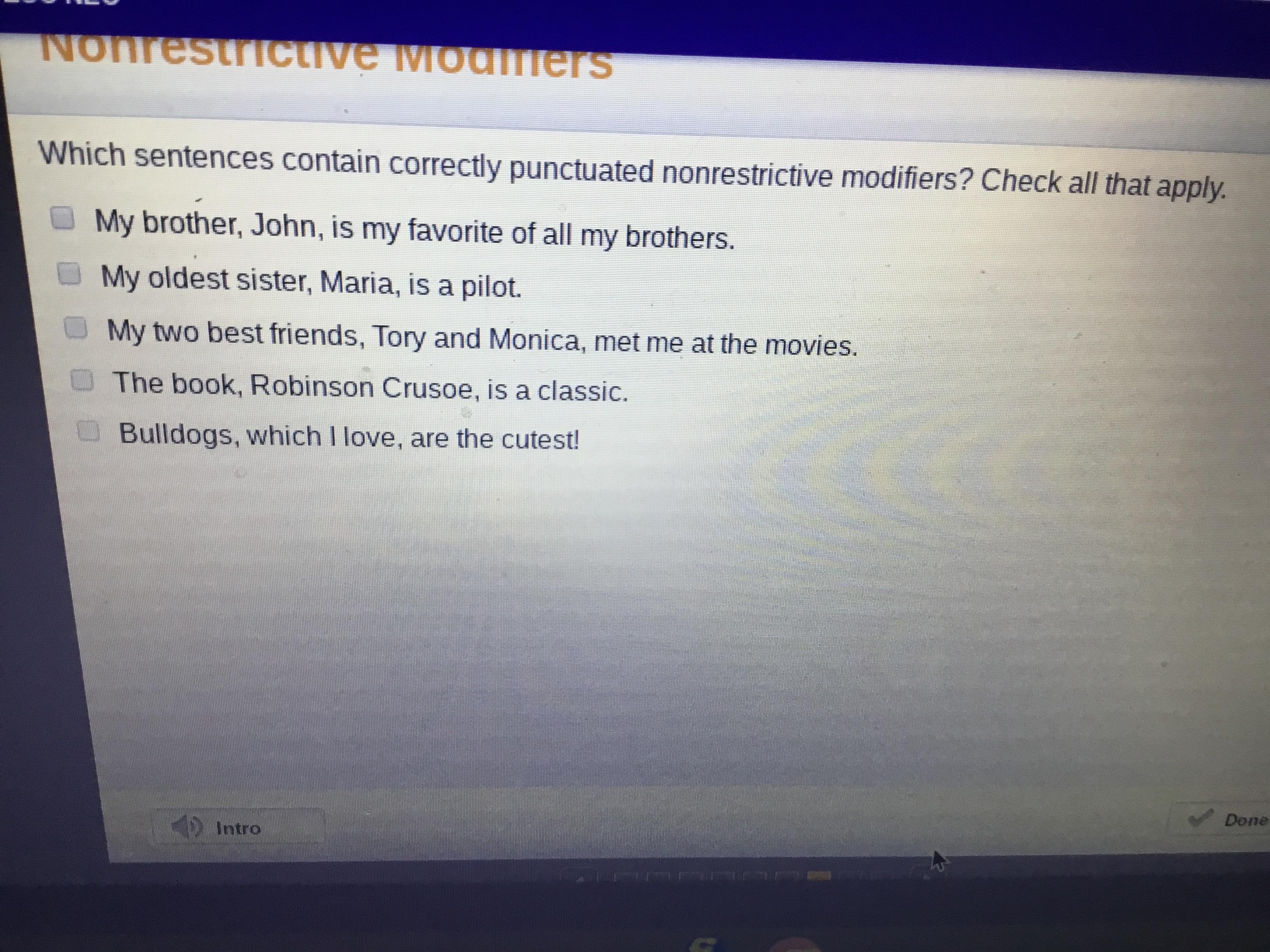 The correct answers are My oldest sister, Maria, is a pilot/ My two best friends, Tory and Monica, met me at the movies/ Bulldogs, which I love, are the cutest!