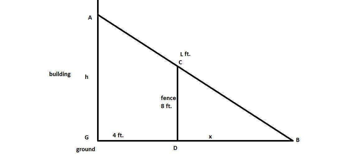 The length of the shortest ladder that will reach from the ground over the fence to the wall of the building is: