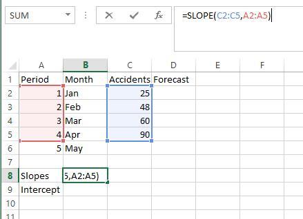 Step 1: get the slope 'm' by using the command <em>=SLOPE(C2:C5,A2:A5)</em>