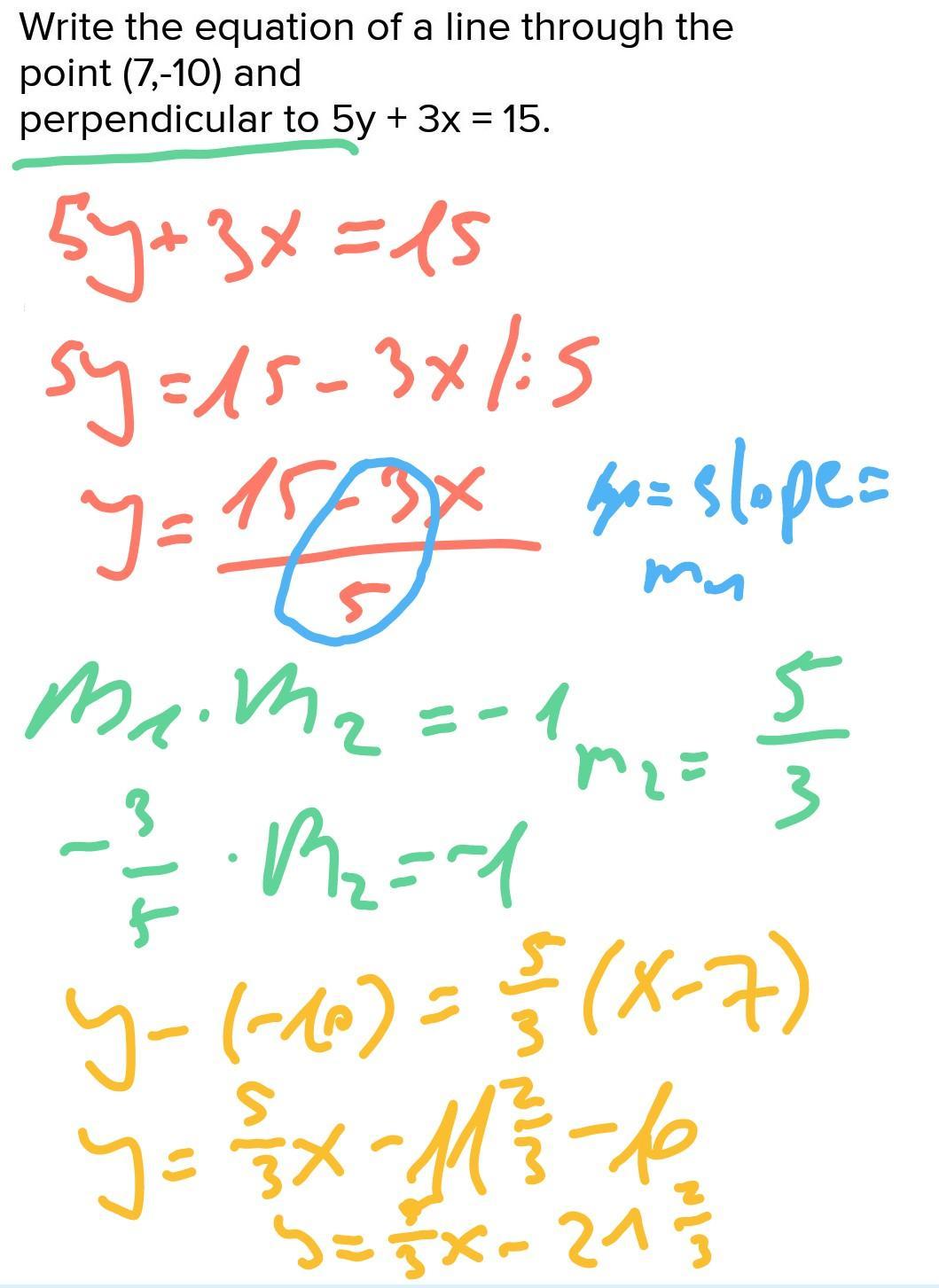Write the equation of a line through the point (7,-10) and perpendicular to 5y + 3x = 15.