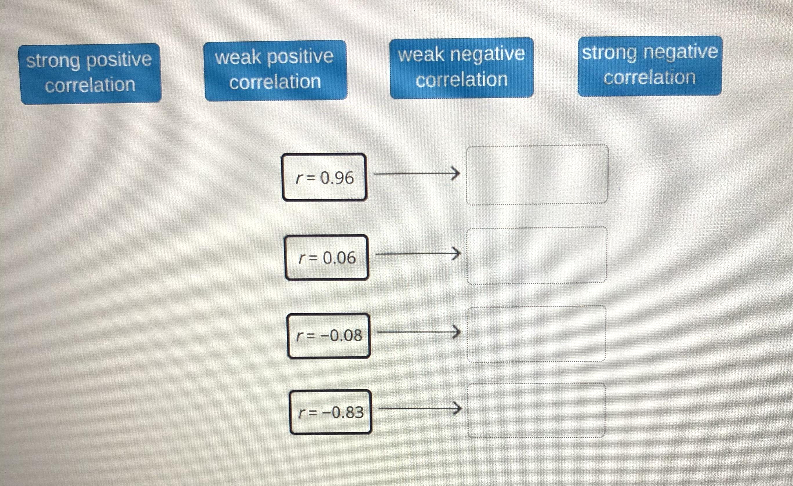 The closer the r value is to 1, the stronger the correlation between the numbers.  If r is positive, then the slope of the data points tend towards a positive, while if r is negative, then the slope of the data points tend towards a negative.  If r = .96, the value is close to 1 and is positive, so it has a strong positive correlation.  If r = -.06, the value is far from 1 and is positive, so it has a weak positive correlation.  This means that the x and y values for the data do not make sense together.  For example, if x was the temperature outside and y was the number of people wearing coats and you observed 20 people outside, a strong correlation coordinate might be (-15, 19).  This means that when the temp was -15, 19 people out of 20 will be wearing a coat, which makes sense.  If you had that only 2 people wore coats, the data together doesn't make any sense.