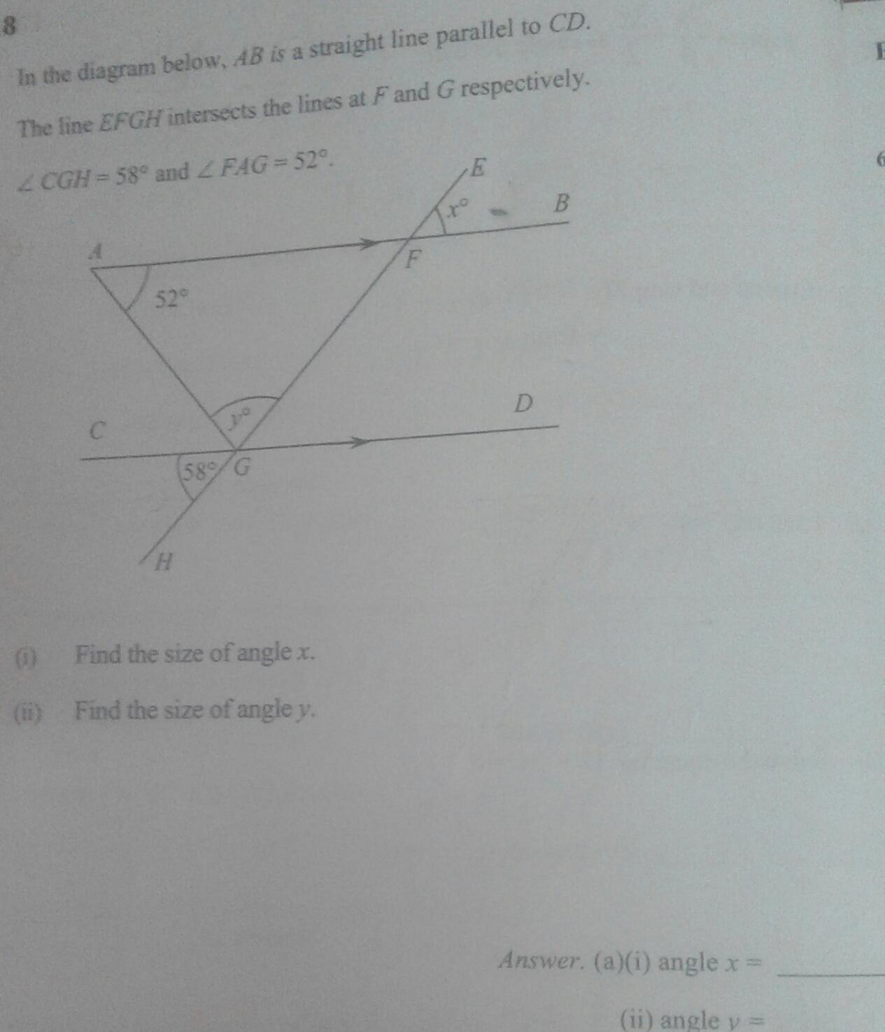 ∠FGD = ∠AFG = 58⁰ (alternate angles are equal)
