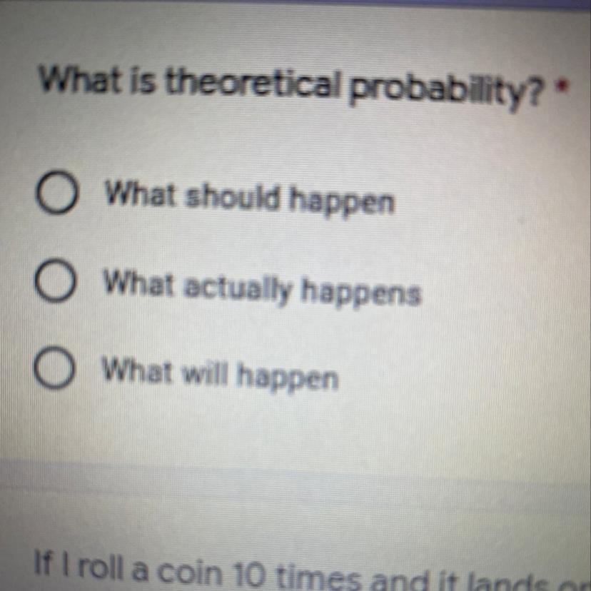 It is going to be this because for example theoretically a coin has a %50 chance of landing on heads or tails so if you flip it twice it should land on heads once and tails once