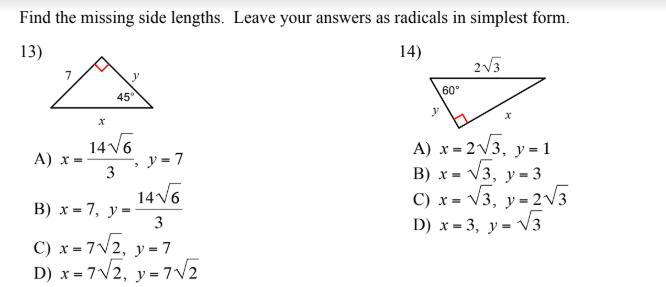 All of this applies to 30-60-90 triangles only. Like with problem 13, if you know two sides of a right triangle, you can use the pythagorean theorem to solve for the third missing side.