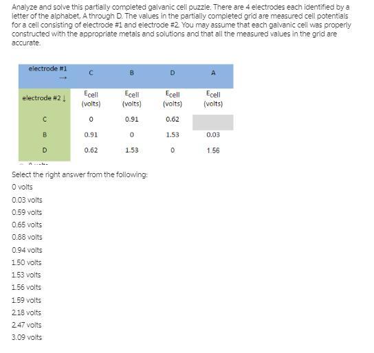 bet, A through D. The values in the partially completed grid are measured cell potentials for a cell consisting of electrode #1 and electrode #2. You may assume that each galvanic cell was properly constructed with the appropriate metals and solutions and that all the measured values in the grid are accurate. electrode #1 ?