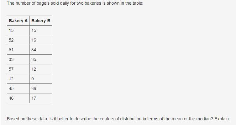 PLEASE HELP The number of bagels sold daily for two bakeries is shown in the table: Based on these data, is it better to describ